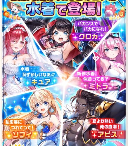 こんにちわどうも、てんたまです。白猫プロジェクトにおいて恒例の夏の水着ガチャの登場キャラのゲーム内での告知が来ましたね。(登場するキャラは既にネット上で公開されてました)登場するキャラは、クロカ、キュア、ミトラ、ソフィ、アピスとなっており…